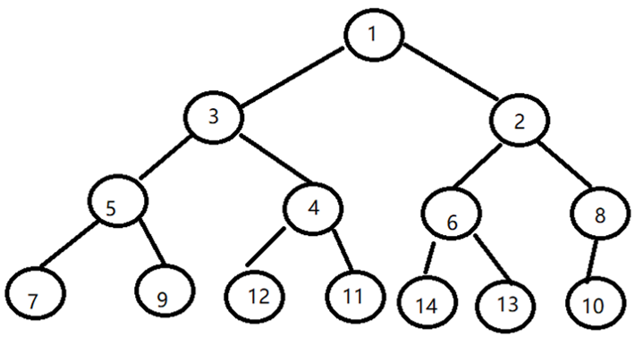 广度优先遍历的结果:[1, 3, 2, 5, 4, 6, 8, 7, 9, 12, 11, 14, 13, 10]
